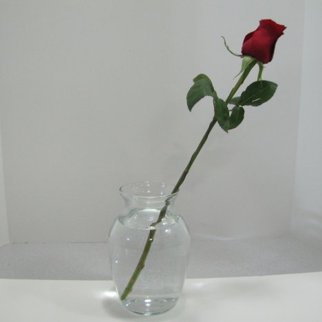 Clean your stem of foliage, leaving some leaves up near the base of the rose head. Hold your rose stem next to the vase. Your rose should be cut to a length around 1 1/2 to 2 times the height of the vase. Remember - the "long stem" look is prized, but you can make even short stems look more impressive by keeping as long of a length as you can above the vase.