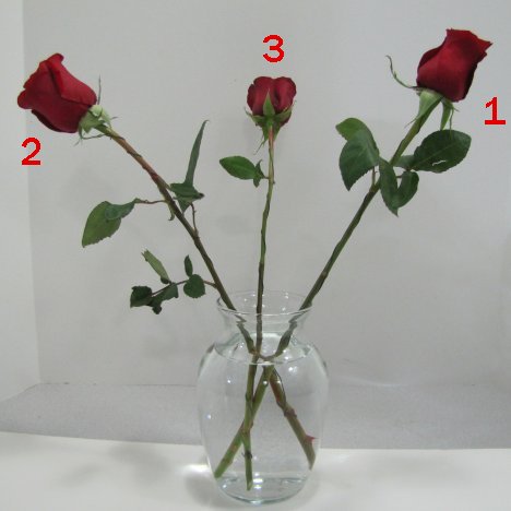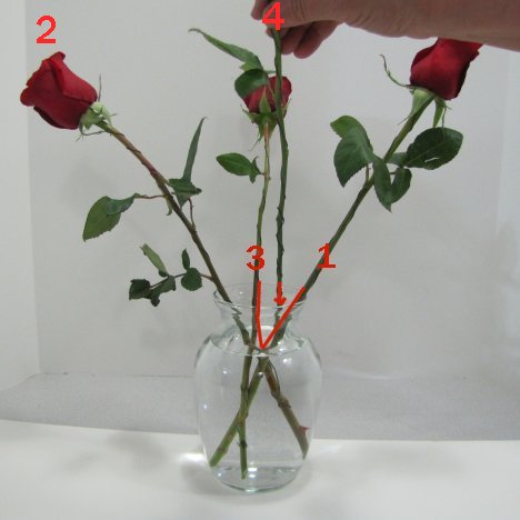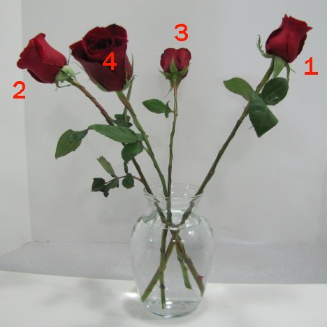 Lean that rose forward towards you (directly opposite stem 3) so that the flowers look like below.