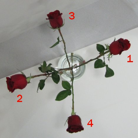 Carefully insert the fourth rose stem in the opposite direction of the third stem, resting it on the "V" caused between the first rose and the third rose.