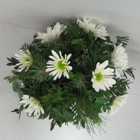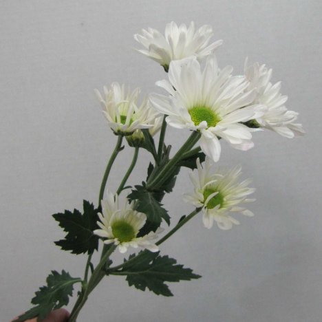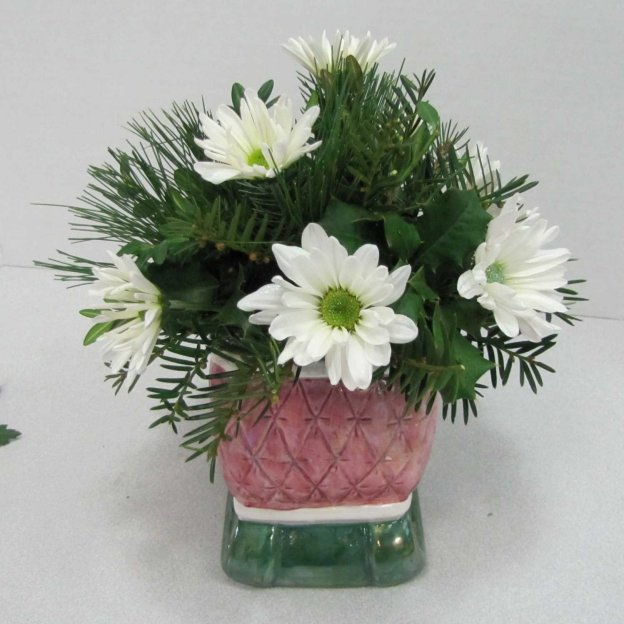 Chrysanthemums are a popular flower used in Christmas designs, because of their long lasting endurance and readily availability. The bright green centers add a festive touch to the colors in the design.