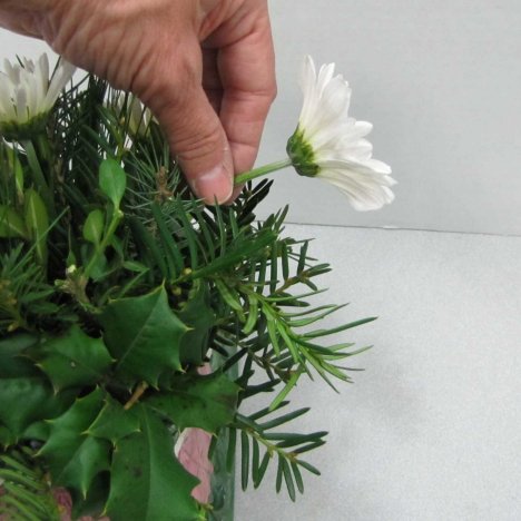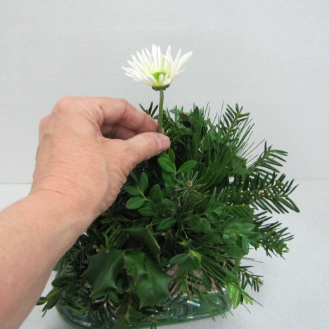 Leave open some areas in which to place the contrasting flowers and some additional items of interest, such as christmas ornaments, ribbon or pine cones.
