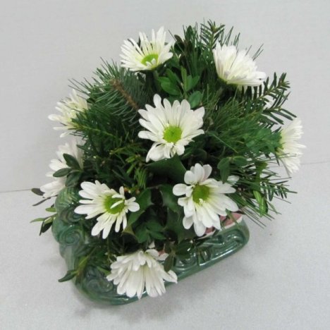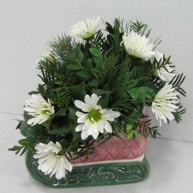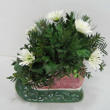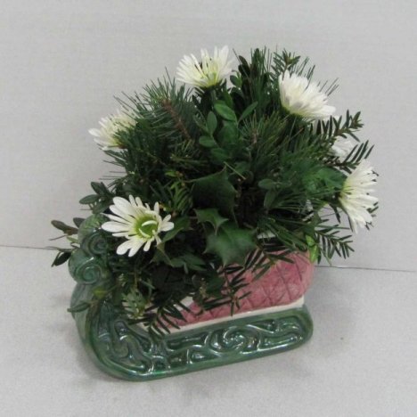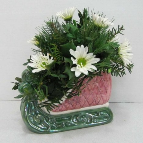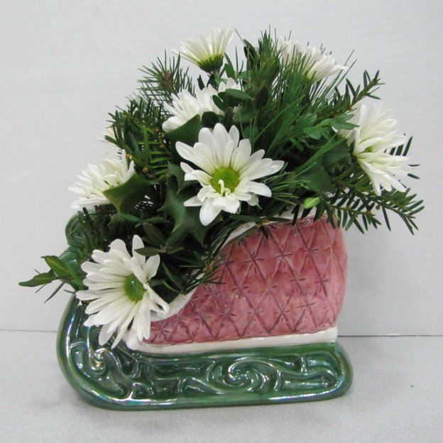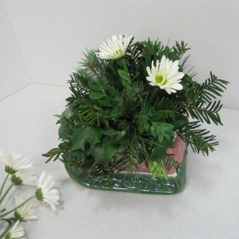 I like to keep the flower heads following the natural shape of the sled. You can do a larger design, but can easily end up with the flowers overpowering the sleigh and becoming simply a hidden container.