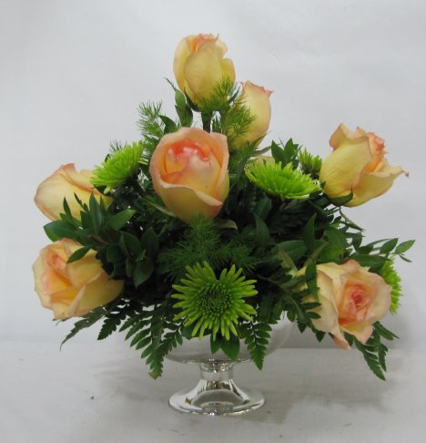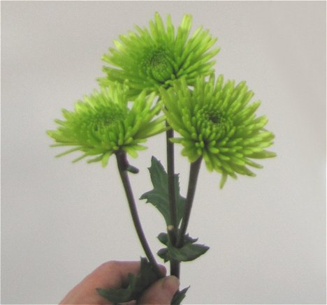 These easy centerpieces flower up fast. The next blooms are these green button mums. The bright color makes this a favorite of many brides. Notice the long laterals that can be cut apart and inserted into the design separately. Keep in mind that these are a living product and there is no guarantee that every green buttons will be this way.