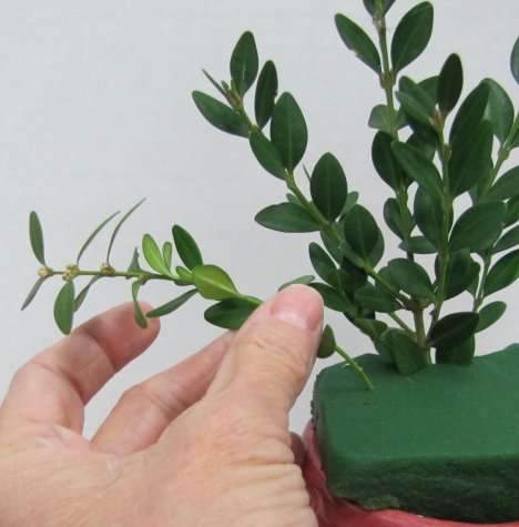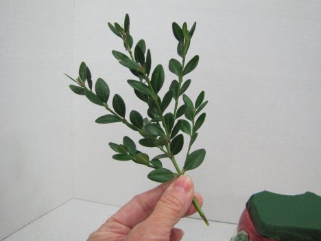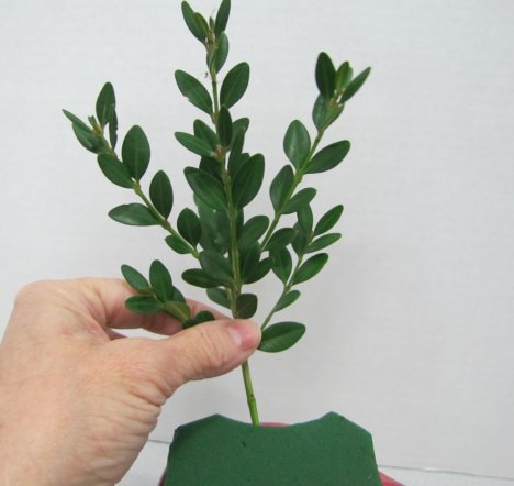 Insert the first stem of boxwood straight up and down in the center of the florist foam.