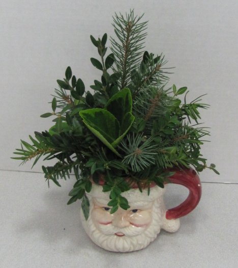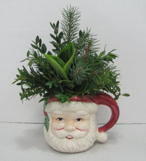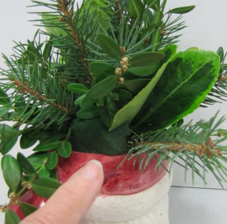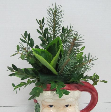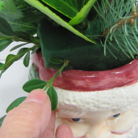 Although I'm careful not to cover up Santa's face, I still want a well rounded look and that includes inserting both greenery and flowers from the lateral sides of the container.