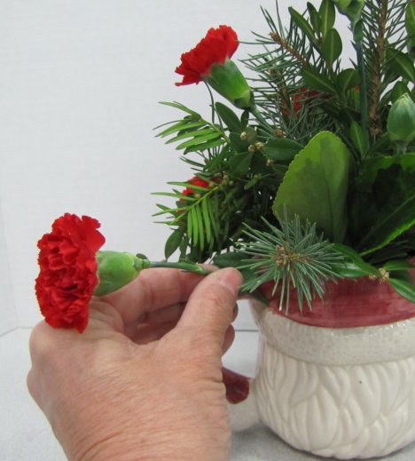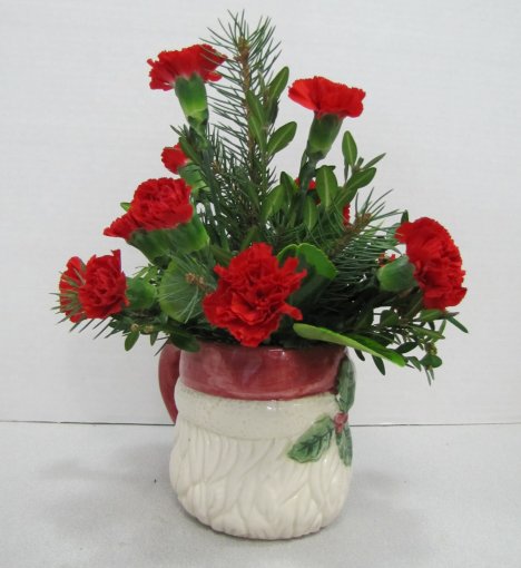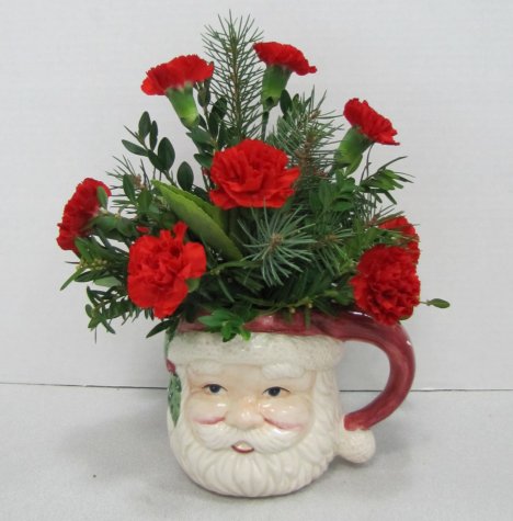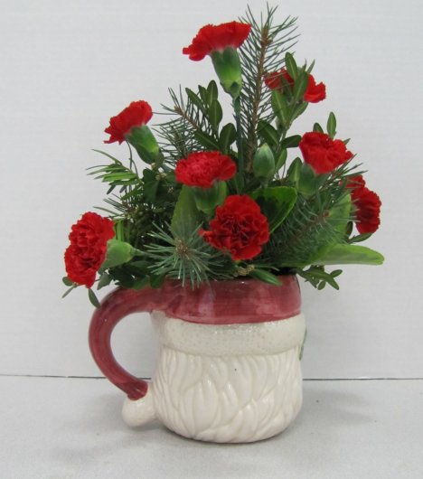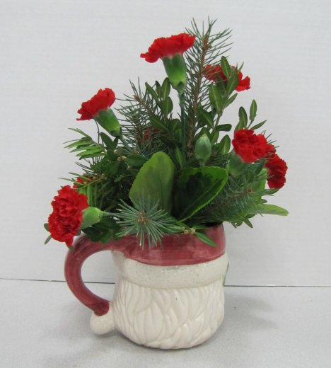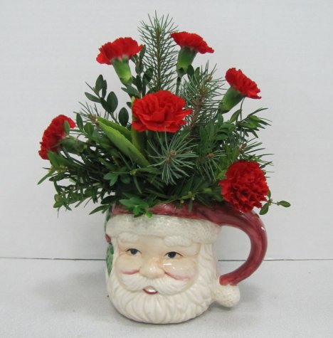 Miniature spray carnations look better in smaller containers, such as this Santa mug. Want to know a secret? Check out thrift stores, such as Goodwill or Salvation Army. They usually have a wide selection of holiday mugs. Pick them up for very little money and put them back to use as Christmas gifts at a fraction of the price of a florist delivery in December.