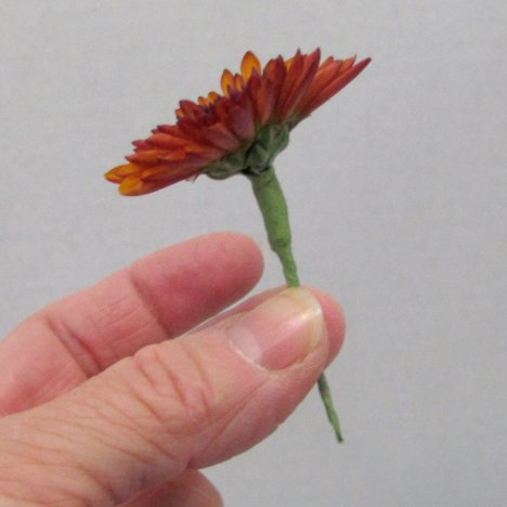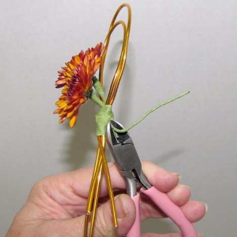 Lay the wire next to the stem, pushing it up through the flower head. Create a hairpin hook and then pull it down (buried inside the center of the head) to make the flower head really secure.