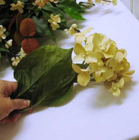 Push deeper into the arrangement, noting the clusters of hydrangea blooms as shown in the photo below.