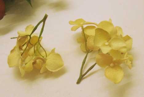 I'm now going to add some hydrangeas. I don't want the large head to overpower the centerpiece, so I'm going to cut apart the laterals of this flower head and wire them separately.