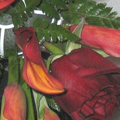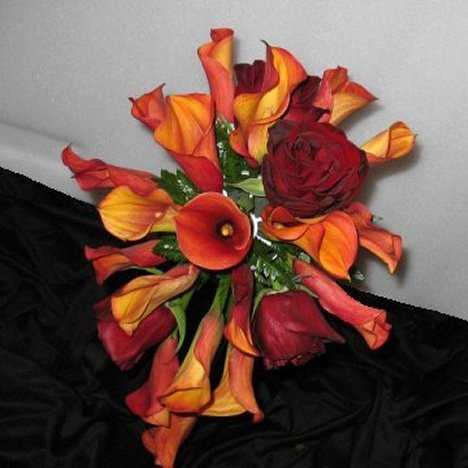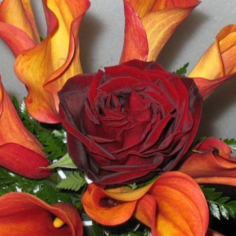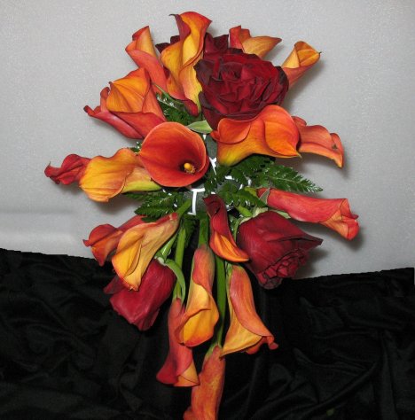 I started tucking the dark red roses in between the orange callas in a random manner.
