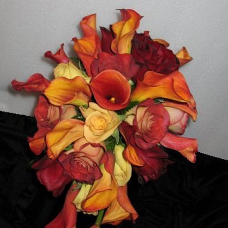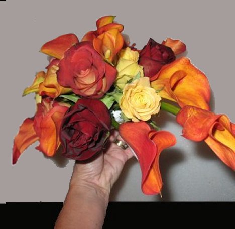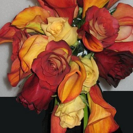 I wanted to add some dramatic contrast to this bouquet without departing from the rich fall tones. Bright yellow roses fit this need beautifully.