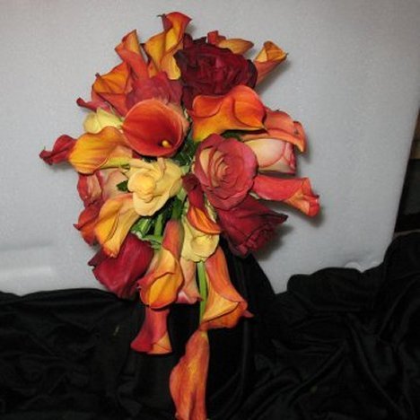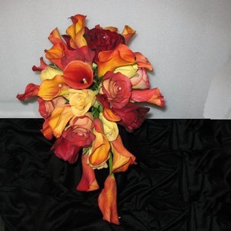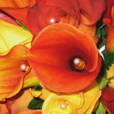 I inserted a pearl headed pin into the center stamen of each calla lily and rose head.