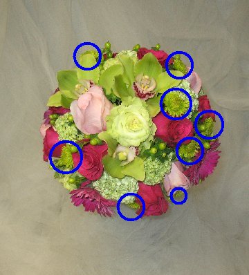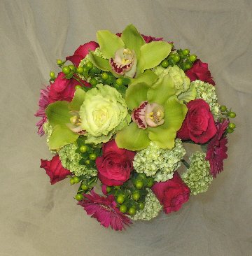 I fill in the hole right between the main focal flowers, which in this case are cymbidium orchids and large, open green roses.