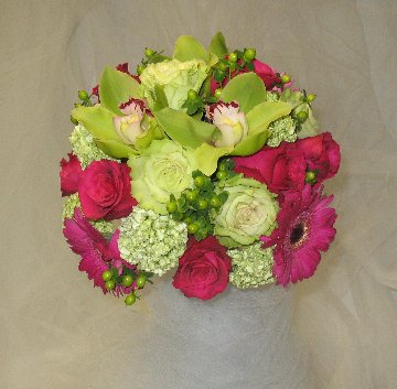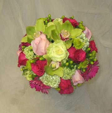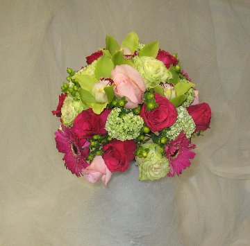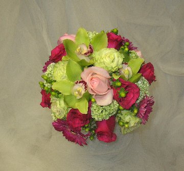 Although subtle, these dainty flowers make a beautiful finish to our final bridal bouquet design. See how beautifully everything has come together, including the cymbidium orchids, hot pink roses, green roses, light pink roses, pink Gerber daisies and green hypericum berries