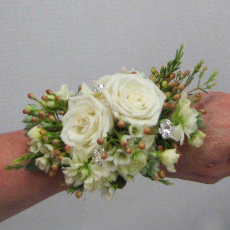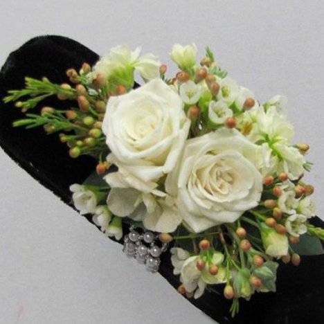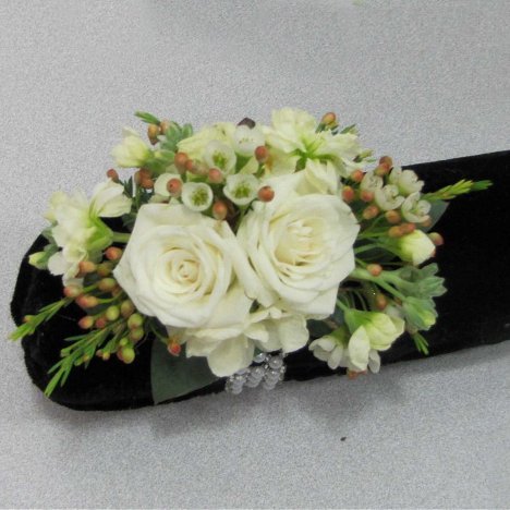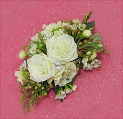 This corsage is easy to complete and fills in quickly with final snippets of wax flower. Don't forget to use the unopened buds at the tip of the stock flower - it adds quite a bit of interest and texture to your corsage design.