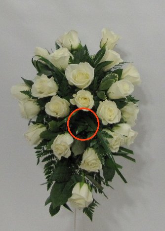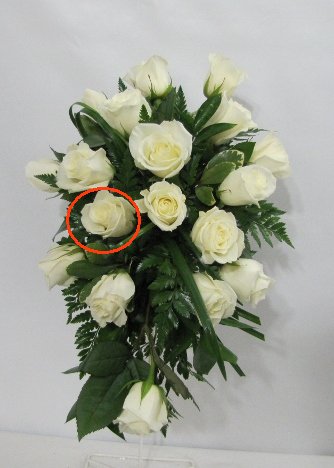 This rose is above the cascade, so it will have a short stem when inserted. Make your stems too long and they will start crowding each other in the foam head.