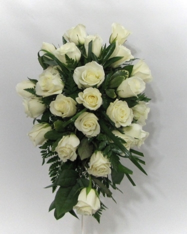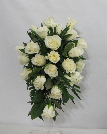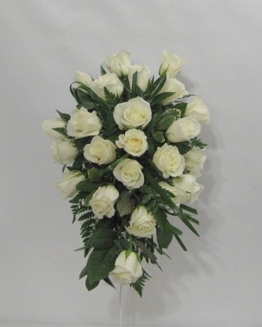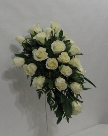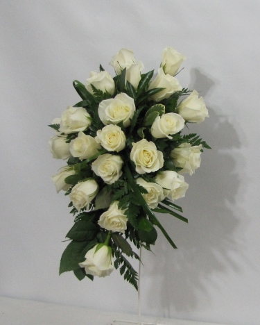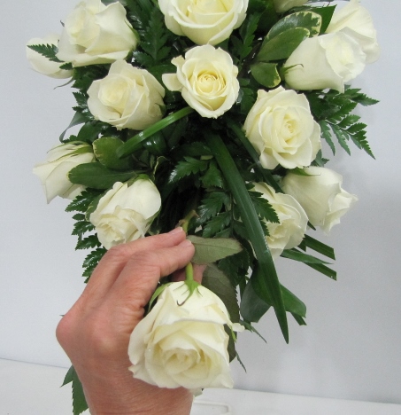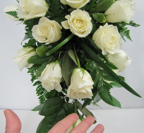 You now have a lovely, traditional white rose wedding bouquet with a traditional cascade. You can do variations on this same design by lengthening the cascade stems and adding more roses.