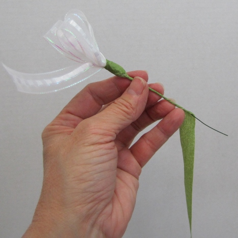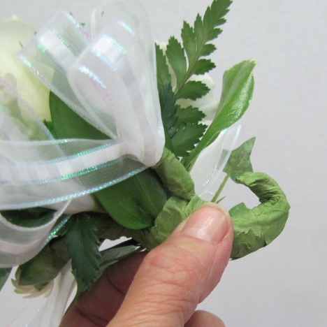Now I'm going to finish off the bottom stem of my corsage design. I could ribbon wrap it, curl it up as is or cut it off shorter. It's just a matter of personal preference.