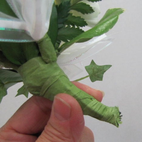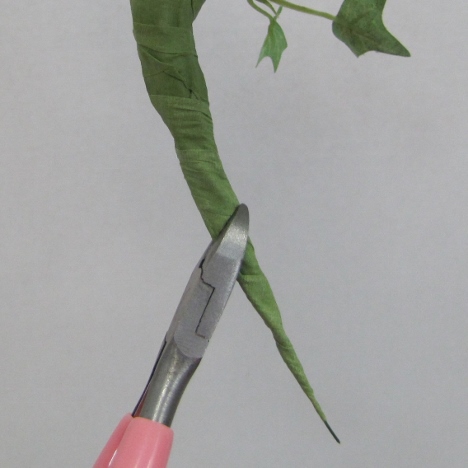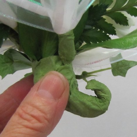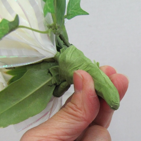 I'm going to cut off the bottom stem and curl it forward and make sure the cut wires are all smoothly covered with floral tape. Before doing that, I'm going to add a bit more ivy on the bottom to fill in that empty space.
