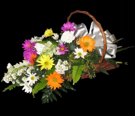 A fireside basket design is an open sided basket that can have the flowers coming out from all sides or looking as if you just picked the flowers from a meadow or flower garden with the flower heads on one sides and the stems on the opposite side. Keep in mind that this is an illusion, because flowers would not last long without a flower source.