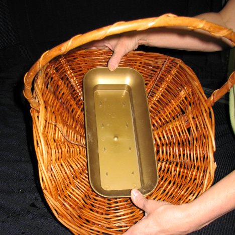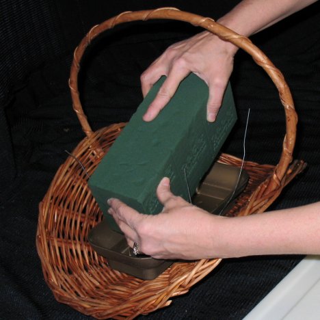 Using paddle wire, cut off about a two foot length to wire the foam to the basket. Wicker has natural open holes that you can take advantage of to secure the cage or container to the bottom of the basket.