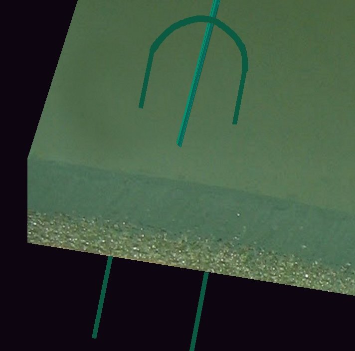 Cut a long piece of Paddle Wire, bend into a hairpin shape and pierce through the florist foam side, having both cut ends emerging from the bottom (Styrofoam) side. I slip a long stake under the loop on the front side (the side that the flowers will be inserted to. The wood stake keeps the wire from sinking too deeply into the arrangement, which could literally cut through the soft foam like a knife. The stake prevents this from happening.