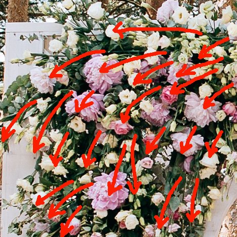 This design was actually done on cages, as you can see the flower stems are literally laying sideways against the arch, inserting the stems into the sides of attached cages. It is really up to the designer to create the design in the way they prefer. I like seeing the heads full on, facing outward. You conceal some of the flower heads by layer insertions like this.