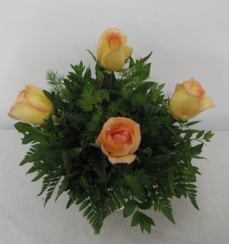 As the roses get closer to the bottom of the arrangement, you can begin to angle the heads of the roses, turning them downward slightly. Try to think of a flowering bush and the natural droop of flowers as they get closer to the ground.