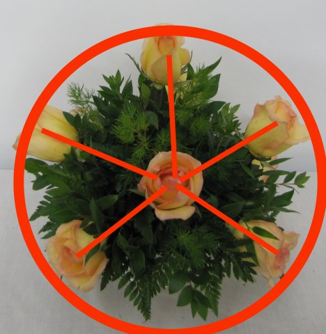 I wanted to give you more of a visual from the top view of how the roses are spaced in the design. Don't worry about being too perfect - just estimate it and stick the flower in! However - it's always best to try to have only one insertion. If you keep pushing flowers in and out, trying to decide where you want to place them, you can begin to degrade your foam.