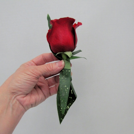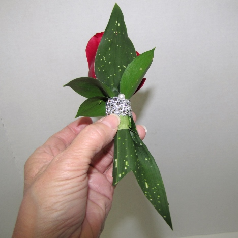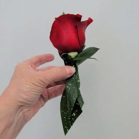 This flower boutonniere has a piece of the aspidistra leaf against it, concealing the rose stem.