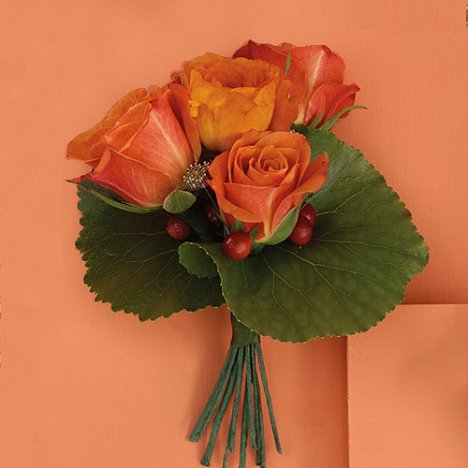 Wire and tape each individual flower. Tape the stems together, clustering a few berries around each flower head. Tuck the Galax leaf on all sides and tape onto the flower stems. If you wish, tape rhinestones, pearls or other flower jewels before adding the galax leaves.