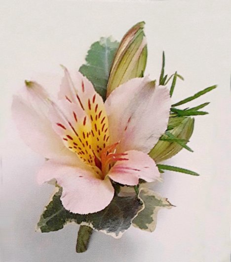 This flower corsage is made entirely of Alstroemeria, also commonly known as "Peruvian Lilies". These little flowers look rather like a perfect miniature orchid and hold up very well in outdoor weddings.