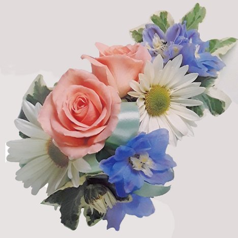 This flower corsage can be created with the wired method or the newer, glued method and can be worn on the shoulder or on the wrist. To create a similar look, you will need the following fresh flowers and florist supplies: