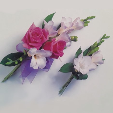 This flower corsage and matching boutonniere would be charming for a young junior bridesmaid or candle lighter. The soft hues of lavender contrast nicely with the bold pink of the roses. For a softer look, consider choosing a paler shade of pink.
