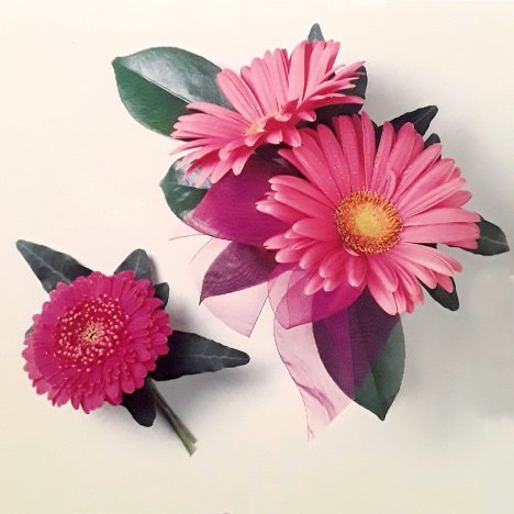 This flower corsage shows standard pink Gerbera daisies. The link takes you to all the color selections, as Gerber flowers come in so many different shades and centers. Keep in mind that as cut flowers, the Gerber daisy wilts faster than other flower varieties. Keep the corsage and boutonniere refrigerated as long as possible before pinning it to the wearer.