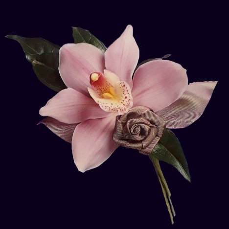 This single orchid flower corsage is made in the shades of palest lavender. Wider ribbon (#9 1.5") will look better than the narrow corsage ribbon used with most multi-head flower corsages. Wire the leaves to make them easier to control and bend so they cup around the large headed flower.