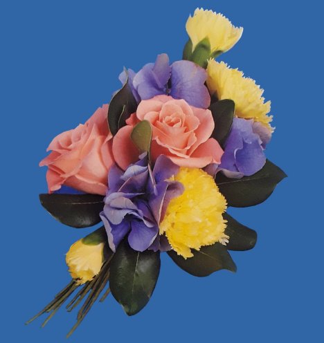 This colorful flower corsage is a combination of roses, hydrangea florets and miniature carnations. I will warn you, however, that I rarely use hydrangeas in corsage work, as they wilt quickly. Better would be a flower such as a snapdragon floret, which would hold up better than the flower shown.