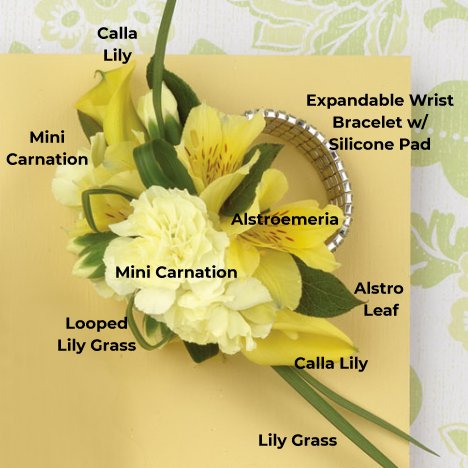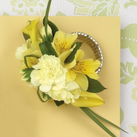 This flower corsage is a sweet blend of pale and darker yellows. Calla lilies, miniature carnations and sunny alstroemeria are ready to slip on any girl's wrist. This design is quick and easy with the flowers being glued directly on the silicone pad of a corsage bracelet.