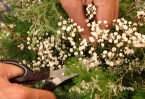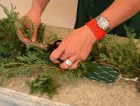 Fill in with bulk greens. Good choices are leather leaf, ming fern, salal tips and Christmas greens.