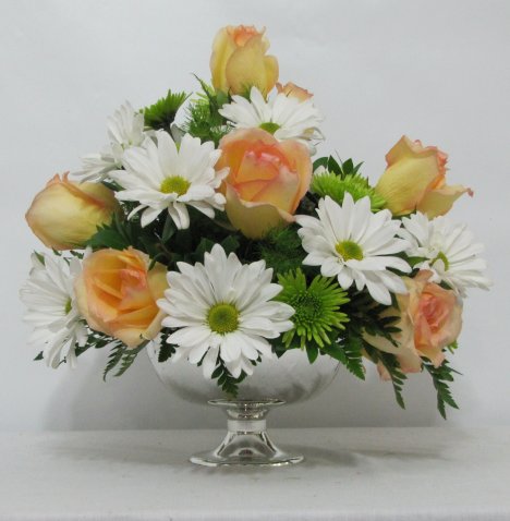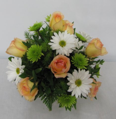 Fill in with the white daisies until all the "open" spaces are covered. Be sure to turn your arrangement around and look at it from all directions.