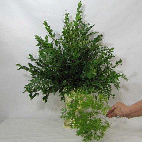 Your basic greening is completed and could be flowered in now. I do like to add in more different types of greenery, because the variety of textures and colors add as much to the design as the flowers do. For example, ming fern has a lovely light green color that contrasts with the darker greens.