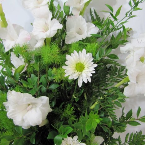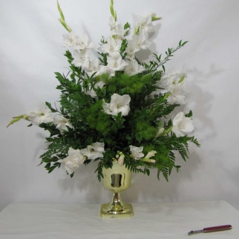 Evenly distribute the gladiolus from all sides, radiating out in different directions from the heart of the altar spray.