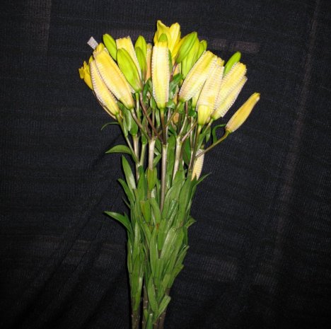 Wholesale flowers are shipped to keep the heads as protected as possible. Some flowers, like these Asiatic lilies, have protective netting over the heads that you remove when you cut and place into water buckets.