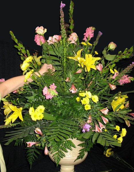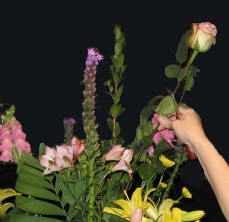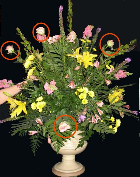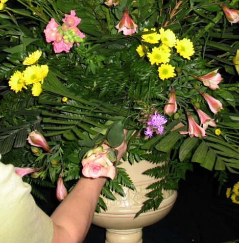 I'm adding in some large headed roses to pull out more of the pink in this design. These flowers are being used in the bridal bouquets and I want the color to be emphasized.