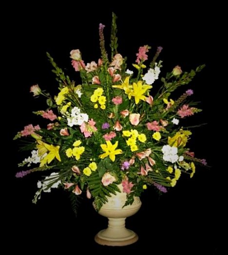 Large flower arrangements for a wedding take a little extra effort. Because of their size and weight, they are a little difficult to transport and may need to be designed on site. Change the colors and flower varieties to match your own wedding palette.