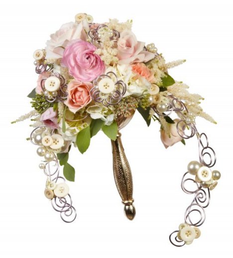 This fresh flower wedding bouquet has a crescent made from decorative wire instead of flowers. This modern bouquet can be made in different colors, making it a bold statement rather than a pretty, muted blush look.