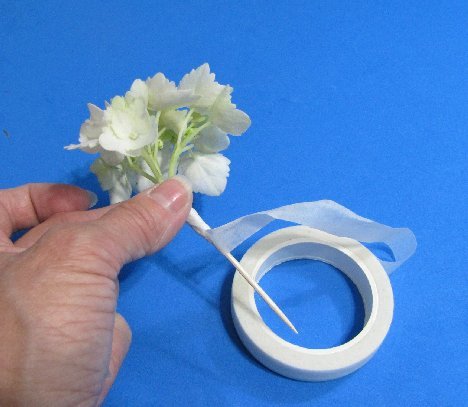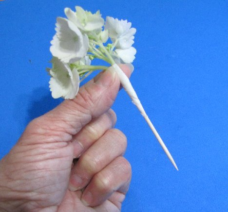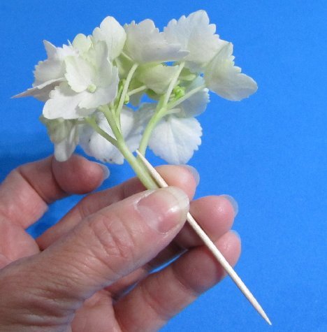 The finished skewer is ready to insert into the cake. (Remember that hydrangeas have to be put into refrigerator quickly - don't leave them lying out in the warm air for real long.