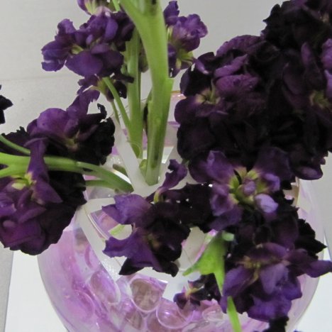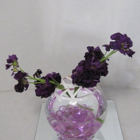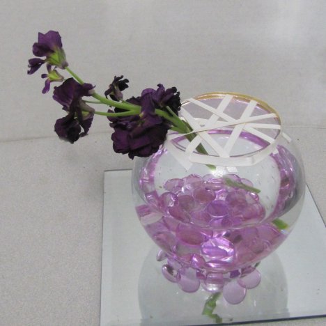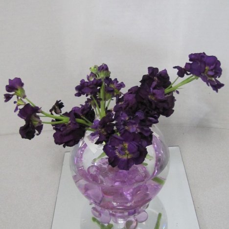 Now that your glass bowl for these centerpieces is gridded, let's begin adding flowers. The first is spray stock. Regular stock is one stem with a solid mass of flowers, whereas the spray stock branches off into several laterals.
