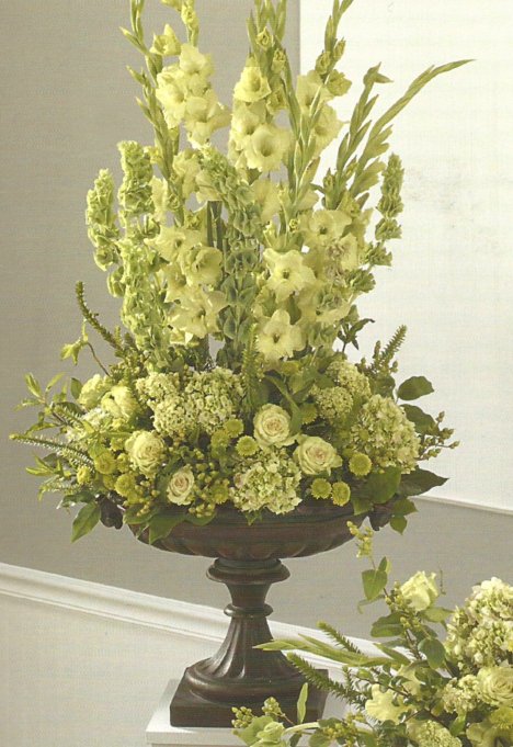 Allow the florist foam to float soak in water treated with Crystal Clear Flower Food. Please read the large urn tutorial and see how a smaller container inside a larger is packed in with brown paper, etc. You have to think ahead on how to transport such a tall arrangement. Although this is a smaller urn, use the mache inside the 12" Urn and pack around it with paper once arrived at the ceremony venue.