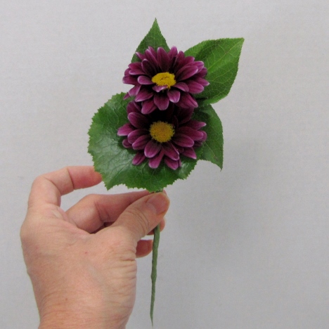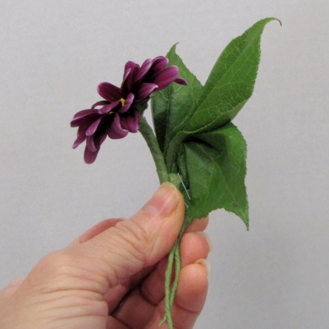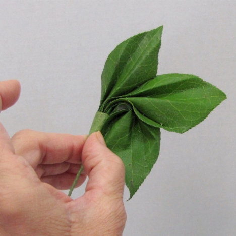 I bend the flower head slightly forward and place the pleated trio of leaves behind the flower head.